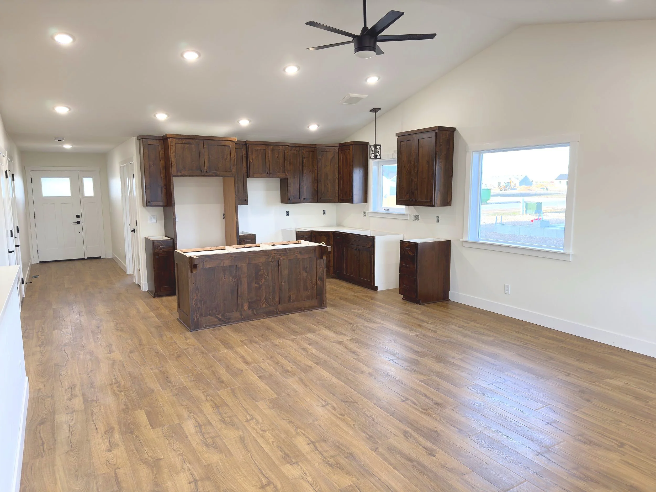 Empty kitchen with dark wood cabinets, hardwood flooring, white walls, ceiling fan, and large windows.