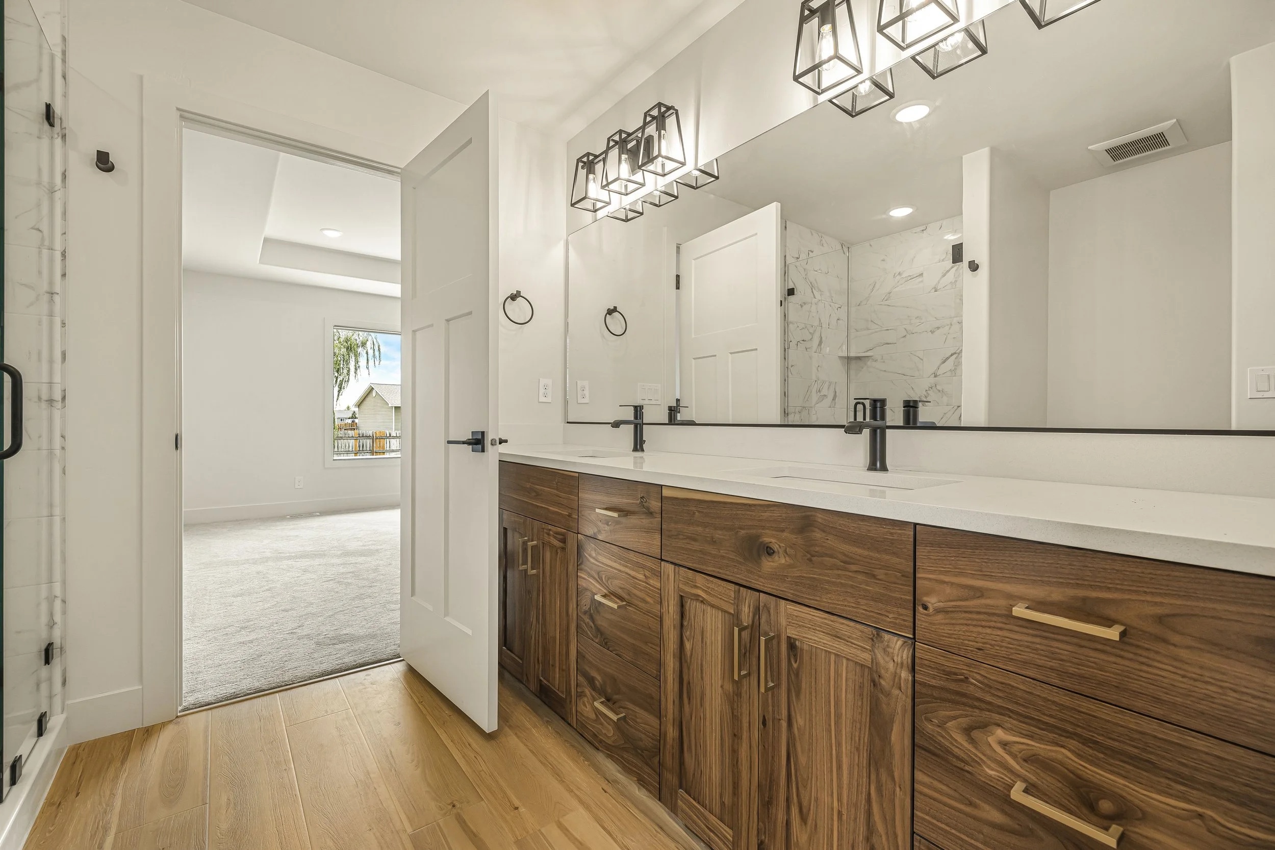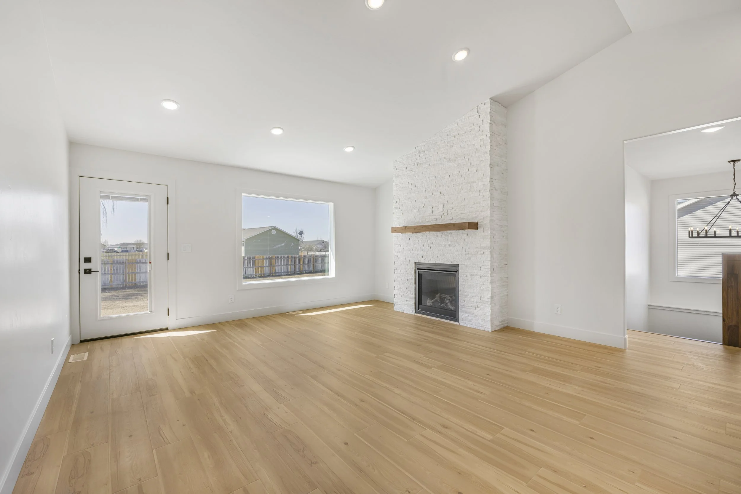 Empty living room with white walls, hardwood flooring, large windows, a glass door, a white painted brick fireplace with a wooden mantel, and a partial view of a dining area with a chandelier.