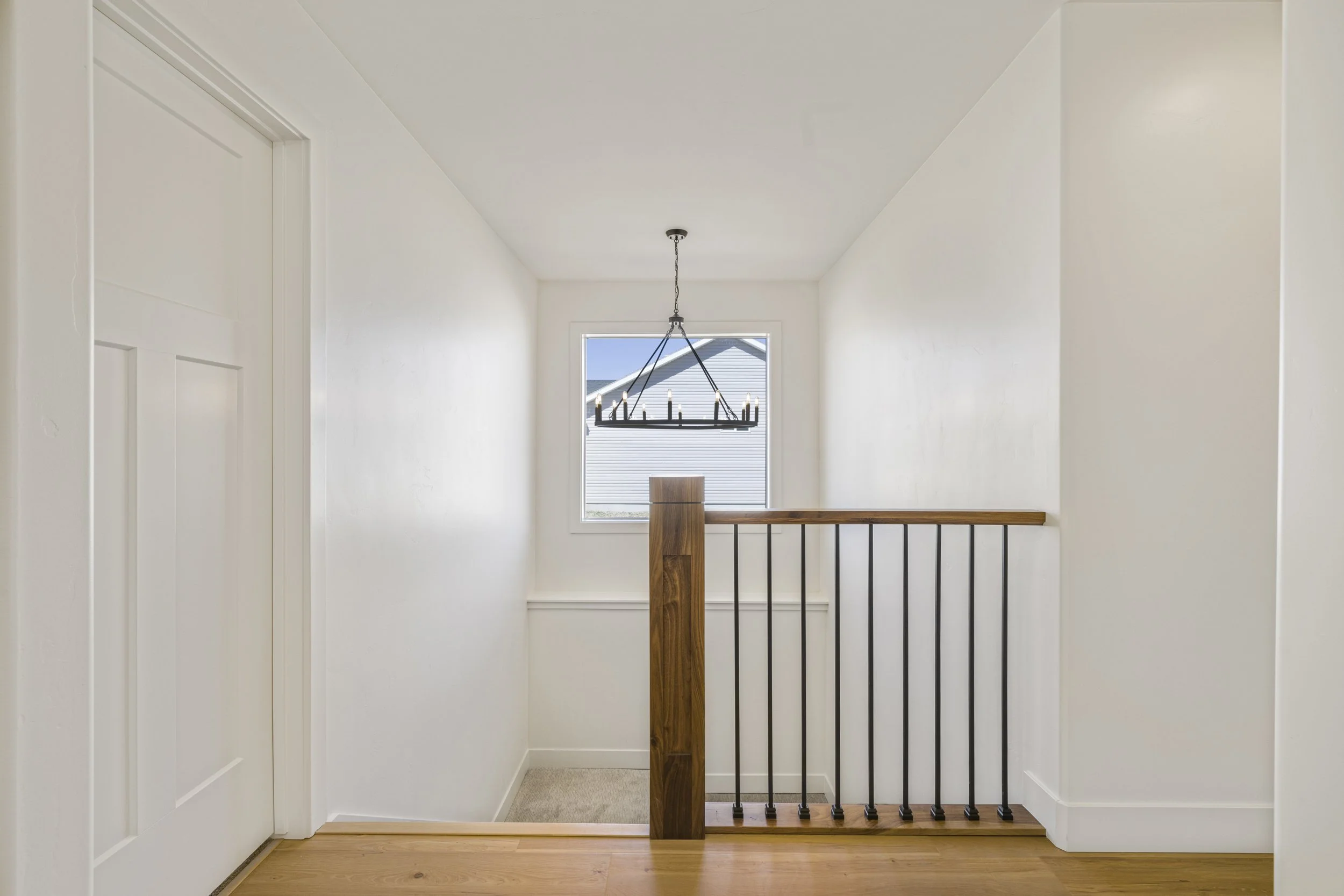 Interior view of a staircase landing with white walls, a window showing a neighboring house, a black and wood chandelier hanging from the ceiling, and a wooden railing with black spindles.